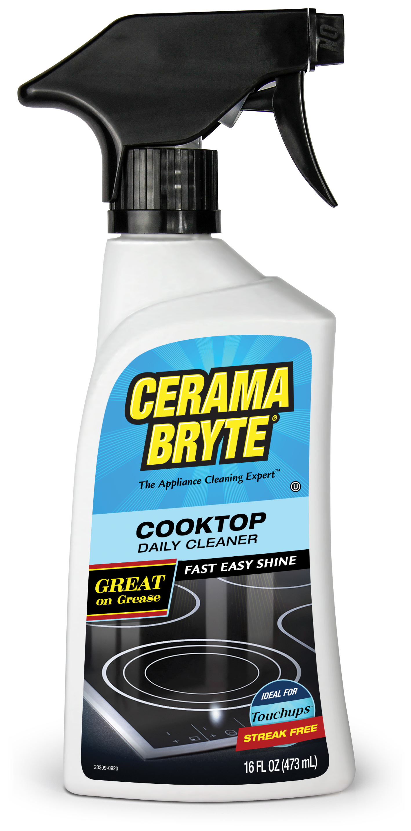 On a cool stovetop, squirt a nickel-sized drop of Cerama Bryte Stovetop Cleaner on each burner. Rub briskly with a Cerama Bryte Cleaning Pad or with a dry paper towel. Follow with another dry paper towel to buff off the excess and to remove streaks.